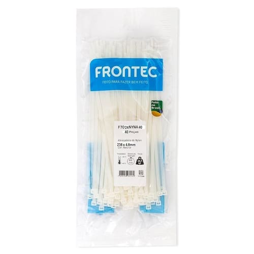 Abraçadeira nylon 4,8 x 238mm branca frontec 40 una frontec fabrica no brasil, uma linha de abraçadeiras de nylon especialmente desenvolvida para resistir a raios ultravioleta e a intempéries. Elas podem ser utilizadas, por longos períodos de tempo expostas ao sol mais de 10 anos .Estas abraçadeiras são produzidas com nylon 6.6 e aditivos, que impedem o rompimento da estrutura molecular da peça, proporcionando resistência quando utilizadas em ambientes externos.Especificações técnicas:medida da peça:4,8x238 mmmaterial: nylon 6.6 com proteção uvtemperatura de utilização: -40c a 85cflamabilidade: ul94 v2tensão mínima de ruptura: 8,2kgfa melhor maneira de fazer amarrações bem feitas com rapidez, segurança e economia em ambientes expostos à luz solar e com intempéries por longos períodos de tempo.Característicascor: branca natural largura: 4,8 mmcomprimento: 238 mmmarca: frontec