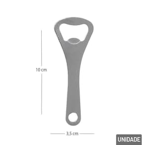 Abridor de Garrafa EM Inox 10cm Resistente O Abridor de Garrafa um item indispensável para qualquer cozinha, churrasco ou momento de lazer. Fabricado em aço inoxidável de alta qualidade, ele oferece resistência, longa durabilidade e excelente desempenho na hora de abrir garrafas com tampas metálicas. É compacto, resistente e feito para facilitar o seu dia a dia. Fabricado em aço inoxidável de alta qualidade, ele não enferruja, tem longa vida útil e oferece total praticidade na hora de abrir garrafas com tampas metálicas.\nMarca: RIO DE OUR Tipo de material : Aço Inox Cores ou Estampa : Prata Dimensões do Produto : 10 X 3,5 X 0,5 CM Dimensões da Embalagem : 17 X 6 X 0,5 CM Peso Bruto (Gramas) : 0.020 Marca: Não Informado