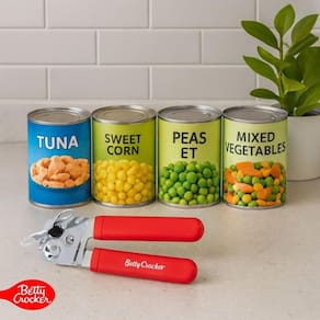 Prático, resistente e com design moderno, o abridor de latas universal da Betty Crocker é indispensável na sua cozinha.