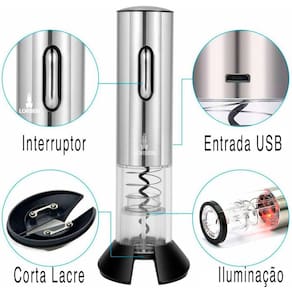 O Abridor de Vinho Saca Rolha Elétrico, com bateria recarregável, é um item essencial no bar ou cozinha, pois garante que você abra qualquer garrafa de forma segura e fácil, sem acidentes ou imprevistos. Retira as rolhas com maior facilidade sem necessidade de fazer força e correr risco de quebra da garrafa. Basta apertar um botão. Possui também luzes led indicadores de operação, o que torna o abridor ainda mais bonito.• Fácil de usar• Sem fio, funciona com bateria recarregável e acompanha cabo carregador USB• Ergonômico, encaixa-se perfeitamente na palma das mãos• Desenhado para se encaixar em, praticamente, qualquer tipo de garrafa de vinho tradicional• Tempo aproximado para abertura de cada rolha: 7 segundos• Vem com uma base que também é um corta-lacre• Capacidade: abre mais de 30 garrafas com a bateria completamente carregada• Tempo de recarga da bateria: 8hMarca: LorbenMaterial: Plástico e aço inoxCor: PrataVoltagem: Bivolt (110V ou 220V)Tensão nominal: 6VInclui:1 Abridor elétrico1 Base1 Carregador USBTamanho do produto: 19,5x4,5x4,5cmPeso do produto: 315gTamanho da embalagem: 25x10,5x8,5cmPeso da embalagem: 425gCódigo do produto: 883Fotos meramente ilustrativas. Tonalidades podem variar.