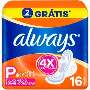ABSORVENTE ALWAYS SUPER PROTEÇÃO SUAVE COM ABAS Sinta-se limpa e confortável com o novo “Always Super Proteção” com formato anatômico, desenhado para a mulher brasileira, que se adapta ao seu corpo e