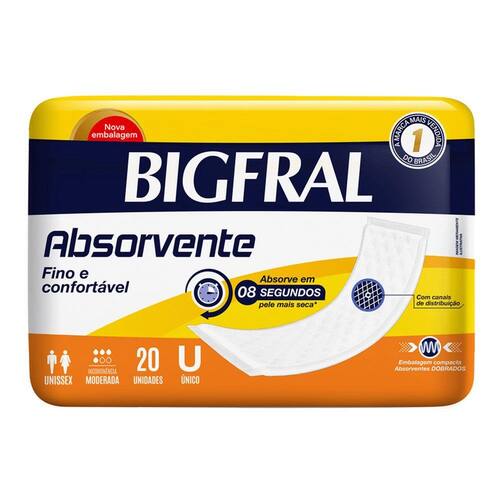 Absorvente Bigfral Bigmaxi - Bigfral Absorvente é indicado para incontinência leve a moderada, pós parto e pós cirúrgico - É o único do mercado com rápida absorção - Absorve em apenas 8 segundos, deixando a pele mais seca - Mais fino e discreto, garante total conforto e discrição durante o uso - Sua embalagem agora está mais compacta, tornando o produto mais fácil de carregar e guardar em casa.