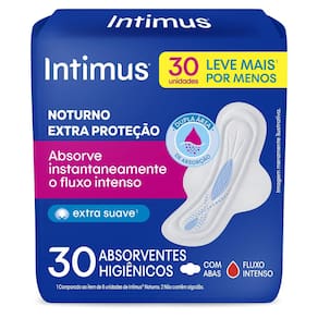 Para noites mais tranquilas, escolha certa. O Absorvente Intimus® Noturno extra proteção absorve rápido e previne vazamentos. Isso só seria possível pela dupla área de compreensão: No centro e atrás,