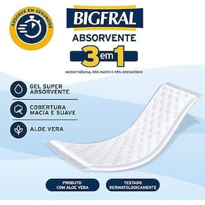 O Absorvente Bigfral 3 em 1 foi desenvolvido para incontinência leve a moderada. Absorve em segundos e possui uma cobertura macia e suave com aloe vera Ean: 7896012880531