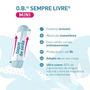 O.B. SEMPRE LIVRE é um absorvente interno desenvolvido por uma ginecologista para proporcionar proteção e conforto para a mulher durante o período menstrual. O núcleo absorvente de O.B. SEMPRE LIVRE é