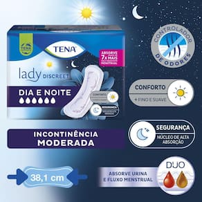Tena Lady Discreet Dia e Noite é uma linha exclusiva para mulheres, com absorventes desenhados especialmente para perda de urina moderada. Indicado para usuárias ativas com mobilidade. Absorvente Lady Discreet Dia e Noite proporciona conforto durante o dia com seu design fino e suave ao mesmo tempo que proporciona a segurança durante a noite através do seu núcleo de alta absorção. Tena Lady é seguro, possui controle de odor e absorve cerca de 7x mais que um absorvente menstrual.