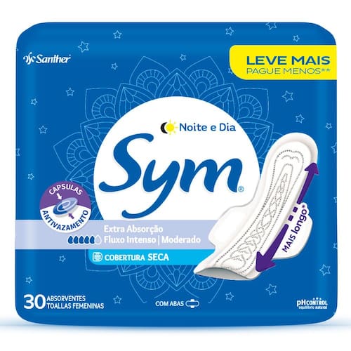 Absorventes Femininos Sym Noite e Dia - 30 Unidades Durma tranquila e viva seus dias com confiança usando os Absorventes Femininos Sym Noite e Dia. Com 30 unidades em cada embalagem, esses absorventes