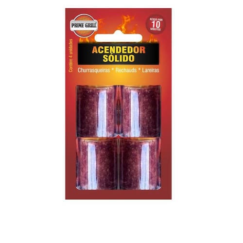 Acendedor álcool solido blister com 4 un prime grill Os acendedor álcool sólido são práticos, econômicos e seguros. Eles não transferem cheiro aos alimentos e ambiente, não fazem fumaça e permanecem acesos por 10 minutos, facilitando o acendimento. Basta colocar uma unidade entre os carvões ou lenha e acenda. O produto pode ser em churrasqueiras, rechauds e lareiras. Principais benefícios Prático e fácil de utilizar. Aceso por 10 minutos. Em caso de contato com os olhos, lavar com água em abundância e se houver sinais de irritação, consultar um médico. Para o acendimento de lareiras e lenhas, utilizar duas unidades Marca: Não Informado