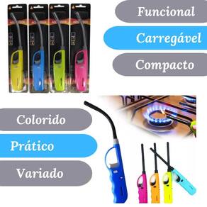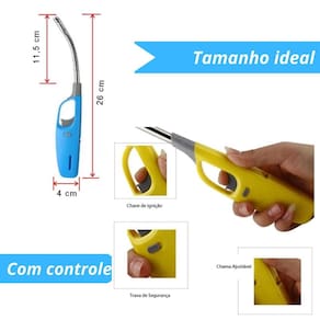 Acendedor a gás multiuso com bico flexível e recarregável. Possui gatilho de ignição, fecho de segurança e regulador de chama.Tipo