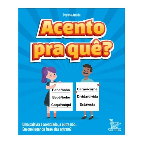 Acento pra quê? é um livro-caixinha® composto por 40 cartas. Em cada uma há uma frase com duas lacunas que devem ser preenchidas com palavras semelhantes, mas com significados e pronúncias diferentes. A obra busca conscientizar crianças e adolescentes sobre a importância da acentuação correta, que leva a funções distintas. Seja pela falta de prática cotidiana, seja pelo desconhecimento das regras de acentuação, essa habilidade tem sido negligenciada, ainda mais com o uso crescente de redes sociais e aplicativos de comunicação, em que as palavras são frequentemente substituídas por abreviações ou emojis, contribuindo para a perda do hábito (ou seria habito?) de acentuar corretamente as palavras. Então, vamos colocar acento (ou não) e começar a diversão.