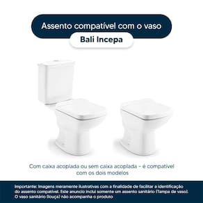 Instalação Simples e Rápida: Com todos os parafusos e componentes necessários inclusos, a instalação é rápida e descomplicada. Seu novo assento estará pronto para uso em questão de minutos. Desenvolvido especificamente para o modelo Bali da marca Incepa, com ou sem caixa acoplada, proporciona um encaixe perfeito, oferecendo estabilidade e conforto durante o uso.