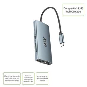 Cor Prata com detalhes cinza escuro Material Chassi em alumínio e cabo de plástico flexível resistente Fornecimento de energia De até 100 Watts Compatibilidade com monitores externos Sim, 2x sendo um pela porta HDMI e outro pela porta VGA Leitor de cartão SD 1x Entrada Leitor de micro cartão SD 1x Entrada USB tipo-C para carregamento do HUB 1x Entrada de até 100 Watts USB tipo-A para conexão de dipositivos 3x Portas 3.1 Gen 1 (5 Gbps) USB tipo-C host (hospedeiro próprio HUB) 1x Cabo 3.1 Gen 1 (5 Gbps) de aprx ~ 15 cm Porta HDMI 1.4 1x Saída Porta VGA 1x Saída Porta para cabo de rede RJ-45 1x com suporte de 1000 Mbps Leds de indicação 3x, Sendo 1x acendendo quando energizado e 2x quando usando a porta do cabo de rede RJ-45 *Fonte de alimentação *Não possui, para carregamento de dispositivos conectados ao HUB se faz necessário o uso de uma fonte externa alimentando o HUB Compatibilidade com sistemas operacionais Windows® 11, Windows® 10, Linux, Mac OS, Windows® 8.1, Windows® 8 e Windows® 7 Conteúdo da Caixa Acer Dongle 9in1 RJ45 Hub ODK390 com cabo tipo-C de aprx ~ 15 cm, garantia e manual de instruções em português do Brasil Dimensões do Produto 112 (C) x 50 (L) x 17 (A) mm Peso do Produto 83g Dimensões do produto com caixa Aproximadamente~ 300 (C) x 300 (L) x 65 (A) mm Peso do produto com caixa Aproximadamente~ 300g EAN 4711474358738 Part Number GP.DCK11.02C NCM 8517.62.54