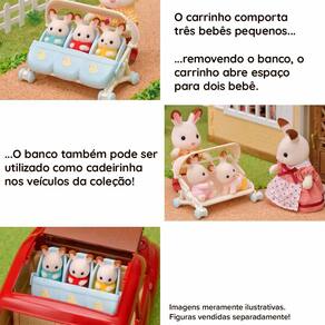 Acessório - Sylvanian Families - Carrinho Trigêmeos - Epoch Magia: Sylvanian Families são adoráveis personagens animais distintos com charmosas e bonitas casas, móveis e acessórios. Eles vivem, trabalham e brincam na idílica e maravilhosa terra de Sylvania. Detalhes: • O Carrinho para Trigêmeos (bebês pequenos) é um carrinho para figuras de bebês trigêmeos • Ao remover o assento, você pode abrir espaço para um par de gêmeos • O assento também pode ser utilizado como assento infantil em um carro da coleção (vendido separadamente) Informações: • Produto: Carrinho de Bebê Trigêmeos • Marca: Epoch Magia • Coleção: Sylvanian Families • Tipo: Carrinho de Bebê para Figuras • Categoria: Figuras de Animais e Pets • Conteúdo: 04 peças - 01 Carrinho de bebê - 01 capota - 01 assento - 01 capa de assento • Recomendação: para crianças a partir de 03 anos de idade Especificações: • Referência: 5533 • Código de Barras: 5054131055335 • Embalagem (C x A x L): 08 x 14.5 x 06 cm • Embalagem (Peso): 0.076 kg • Material / Composição: Plástico Injetado e Tecido • Registro: 004534/2019 • Certificado: Órgãos Autorizados - OCP´S (Organismos de Certificação de Produtos) Aviso: • As imagens são meramente ilustrativas • Os pesos, tamanhos e medidas são aproximados • As cores e estampas dos produtos podem ter variações • As informações são de responsabilidade do fabricante ou fornecedor