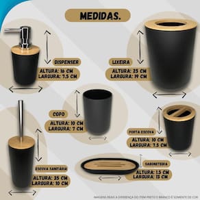 Acessórios para banheiro com 6 peças de estilo contemporâneo envio relâmpago Kit de banheiro 6 peças Mantenha sua casa organizada e limpa com o conjunto de 6 peças. Com um design elegante na cor preto ou branca, é ideal para quem busca praticidade e eficiência. Compacto e funcional, eles se adaptam perfeitamente a diferentes ambientes, seja na cozinha, escritório ou área externa. A qualidade e a resistência do material garantem durabilidade e uso prolongado. Enviada cor disponivel em Conteúdo da embalagem 6 x peças para banheiro Enviada cor disponivel em Características Cor: preto ou branca Número da peça: 6 peças Número de unidades: 6 Enviada cor disponivel em Especificações Dimensões da embalagem: 27,5 x 20 x 20 cm Dimensões do pacote: 27.5 x 20 x 20 centímetros Enviada cor disponivel em Não perca a chance de manter sua casa em ordem adquira agora o conjunto banheiro 6 peças e traga mais organização e estilo para o seu dia a dia Marca: Não Informado