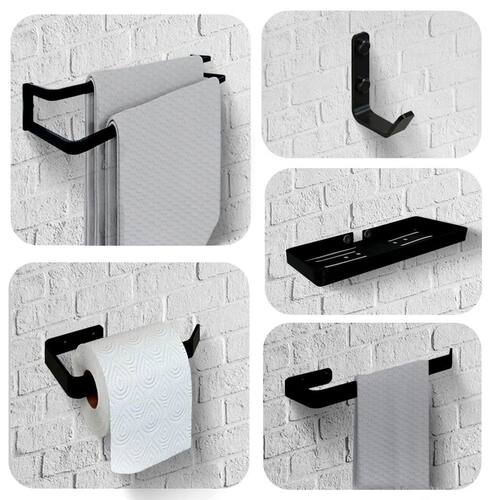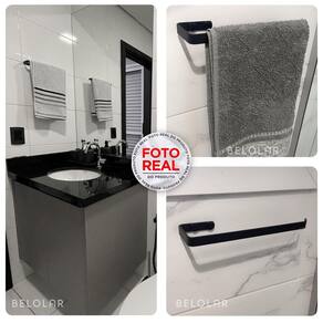 conteúdo Da Embalagem. 1 Porta Toalhas Duplo Para Banho 60cm 1 Porta tolha De Rosto 1 Porta Papel Higiênico 1 Cabide. 1 Porta Shampoo
