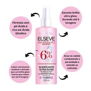 Acidificante ultra gloss a tecnologia de elseve glycolic gloss garante brilho ultra gloss, durando até 6 lavagens e isso acontece pois sua fórmula com ph ácido é rica em ácido glicólico, que atua no cabelo combatendo a porosidade e selando as cutículas dos fios, sendo indicado para todos os tipos de cabelos. O acidificante ultra gloss é o tratamento ácido que combate a porosidade dos fios desde o primeiro uso para impulsionar o gloss no cabelo. Quando o cabelo é exposto a um ph alto, fica poroso, com as cutículas abertas e perde o gloss. A nossa fórmula inovadora com 6% complexo com ácido glicólico e ph ácido lamina as cutículas e corrige as falhas da fibra. Cabelo visivelmente saudável e alinhado para um brilho gloss intenso que resiste por até 6 lavagens. . Modo de uso ainda com o condicionador aplicado, sem enxaguar, divida o cabelo em quatro partes e use o spray diretamente nos fios cobrindo-os do comprimento às pontas. Em seguida espalhe com as, mãos. Deixe agir por 5 minutos e depois enxágue. É recomendada utilização 2x na semana ou quando sentir necessidade de um boost de brilho. Cabelo curto e/ou pouco volumoso: 5 a 10 pumps por parte. Cabelo médio e/ou volumoso: 10 a 15 pumps por parte. Cabelo longo e/ou muito volumoso: 15 a 20 pumps por parte. . Composição água, álcool cetoestearílico, brassica-amidopropil dimetlamina, óleo de coco, hidróxido de sódio, hidroxicitronelal, octissalato, ácido salicílico, xilose, limoneno, linalol, caprililglicol, ácido tartárico, octildodecanol, hexil cinamal, ácido glicólico, monoestearato de glicerila, perfume.