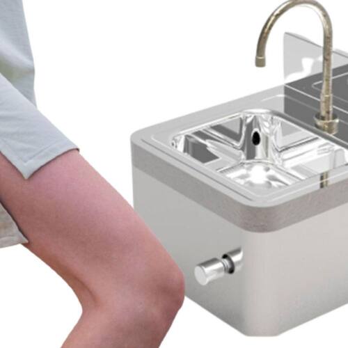 Por não utilizar energia elétrica, nunca haverá riscos de ficar sem lavar as mãos. Para acionar, basta pressionar a coxa ou o joelho no acionador.
