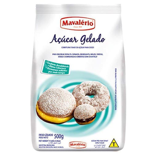 Açúcar Gelado 500G - Mavalério Aplicação: Ideal para cobertura de Donuts, sonhos, croissants, bolos, tortas e biscoitos. Permanece no produto sem derreter. Informações do produto: Peso: 500g. Tabela Nutricional: Porção de 5g 1 colher de chá : Valor Calórico 20kcal/84kcal; Carboidratos 4,3g Ingredientes: Dextrose, amido, gordura vegetal hidrogenada, farinha de arroz e corante inorgânico dióxido de titânio. Ean: 7896072649185