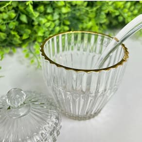 O cristal transparente oferece uma visão clara do açúcar armazenado, enquanto o fio de ouro adiciona um toque de luxo e glamour.