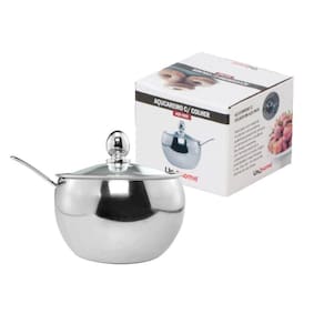 Açucareiro Em Aço Inox Com Tampa De Vidro E Colher Cozinha. Luxuoso em Aço Inox com Tampa de Vidro e Colher ,material resistente e de excelente qualidade. Seu design é super moderno, com formato redondo e acabamento cromado, trazendo toda praticidade e requinte para o seu dia a dia. Um toque de charme a mais em sua mesa. ESPECIFICAÇÕES: -Material: Aço Inox e Tampa de Vidro -Peso: 152gDimensões apenas do Açucareiro, sem considerar a tampa: -Diâmetro Superior: 8,5cmDiâmetro Inferior -base 6cmProfundidade 5,5cm CONTÉM: 01 Açucareiro Em Aço Inox Com Tampa De Vidro E Colher Cozinha