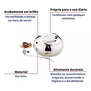 Características: - Diâmetro: 9cm - Altura: 5cm - Altura com tampa: 8cm - Comprimento da Colher: 12cm - Capacidade: 300ml - Material: Inox - Marca: Class Home - Conteúdo: 01 Açucareiro e 01 Colher