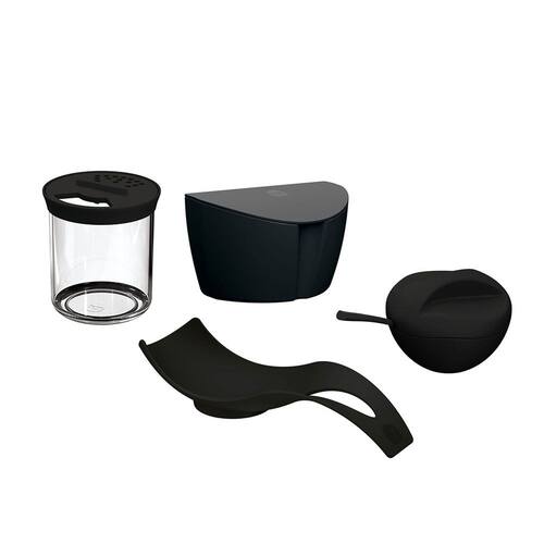 Jogo de saleiro, açucareiro, apoio de colher e farinheiro. Os porta mantimentos sao fabricados em material altamente resistente, 100% reciclavel, atoxico e livre de Bisfenol A (BPA Free). Contem: 1 Saleiro de 500 ml Medidas: 9 x 16 x 8,7 cm 1 açucareiro e colher Medidas: 9,6 x 15 x 11,8 cm 1 Apoio de colher Medidas: 6 x 9,5 x 26,3 cm Material: Polipropileno 1 Pote com Tampa Medidas: 10,2 x 8,8 cm Material: Poliestireno (PS)