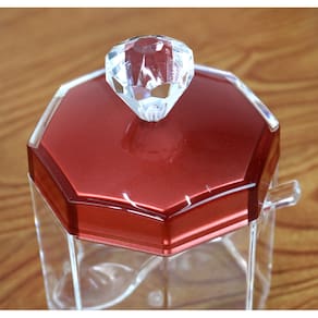 Informações Técnicas: Composição: Acrílico. Diâmetro: 8cm. Altura sem tampa: 7cm. Altura com tampa: 9cm. Capacidade: 250ml. Peso:150 gramas. Validade: Indeterminada.