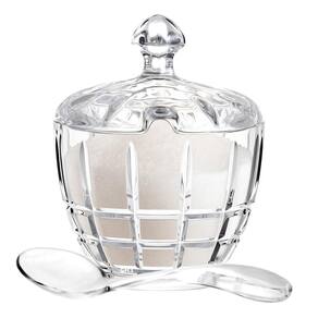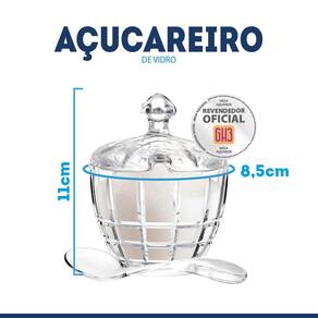 Especificação: Modelo: Açucareiro de vidro Marca: GH3 ou Mek Material: Vidro e colher de acrílico Capacidade: 200g Tamanho: 8,5 x 11cm Peso total: 284g.