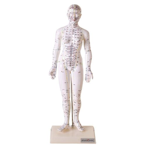 Modelo anatômico de corpo inteiro, feminino, reproduz em detalhes, todos os chacras e meridianos para estudo e aplicação de técnicas de acupuntura. Confeccionado em plástico emborrachado, montado sobre base e haste de metal cromado.