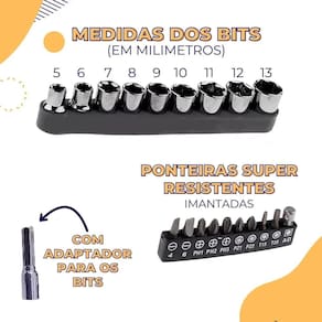 Kit cabo extensor flexível para parafusadeira + adaptador angular 105 O conjunto extensor é perfeito para realizar trabalhos de difícil alcance; o extensor pode ser utilizado em parafusadeira, furadeira ou chave catraca manual, ele é revestido em borracha, fazendo com que suas mãos fiquem seguras, pois ao acionar o gatilho ou girar a sua ferramenta manual, o eixo interno gira e aperta ou desaperta o parafuso escolhido, e para completar esse maravilhoso kit, você tem todos os tipos de pontas bits para acoplar ao seu extensor. Ele funciona auxiliando na realização de trabalhos em lugares apertados, possui facilidade para apertar ou desapertar parafusos em lugares de difícil acesso e pode ser em curva, proporcionando agilidade na execução do trabalho. Caracteristicas 10 Bits sendo eles: 1 adaptador 1/4 2 pontas fendas SI4/SI6 4 pontas philips PH1/PH2/PZ1/PZ2 3 pontas torx T25/T27/T30 9 Soquetes sendo eles: 5/6/7/8/9/10/11/12/13mm Itens Inclusos 1 Eixo extensor 24cm com 2 pontas de 1/4 1 Adaptador soquete 42mm 9 Soquetes 10 Bits 1 Adaptador Angular imantado 105 Magnético 1/4 do vendedor: 30 dias