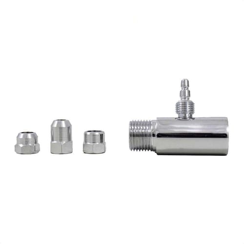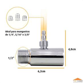 Possui rosca de 1/2" e espigão para ligação de mangueiras com padrão 1/4", 5/16" ou 3/8".