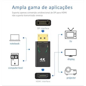 Adaptador conversor DisplayPort para HDMI com suporte a resolução 4K a 60Hz. Ideal para conectar computadores, notebooks ou placas de vídeo com saída DisplayPort em monitores, TVs ou projetores com entrada HDMI. Oferece excelente qualidade de imagem e compatibilidade com diversos dispositivos. Especificações Técnicas: Tipo: Adaptador DisplayPort para HDMI Resolução Suportada: Até 4K a 60Hz Conexões: DisplayPort macho para HDMI fêmea Aplicações: Transmissão de áudio e vídeo digital em alta definição Compatibilidade: Monitores, TVs, projetores e dispositivos com HDMI Permite conexão de DisplayPort em telas HDMI Transmissão estável com suporte a 4K60Hz Fácil instalação e uso imediato Ideal para e doméstico Marca: Não Informado Ean: 7890922724732