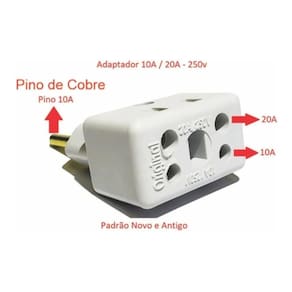Características gerais Cor: branco Entradas: Padrão antigo 2 pinos Padrão antigo 3 pinos Novo padrão 3 pinos Pino 20 amperes de 2 pinos