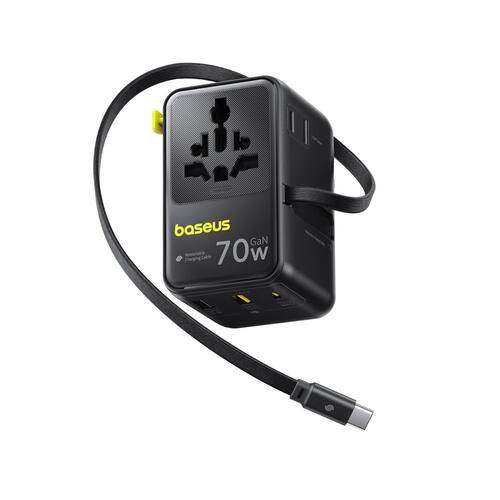 - [Cabo retrátil USB-C de 70 W embutido] - O adaptador de plugue internacional Baseus pode fornecer até 70 W no máximo com o cabo USB-C retrátil embutido, que foi trançado com náilon para suportar o desgaste no uso diário. Basta puxar para carregar em qualquer lugar, a qualquer hora, sem necessidade de carregar cabos extras.