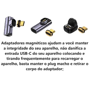 Adaptadores magnéticos mantem a entrada USB-C do seu aparelho intacta, além de manter ao redor da entrada sem riscos e marcas de uso, basta manter o plug na entrada, e retirar o corpo, quando for recarregar, volta a colocar o corpo energizado por um cabo que irá carregar, transferir dados, ou transmitir imagens e áudio!