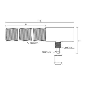 Adaptador para filtro com saída lateral para mangueiras de 1/4, 1/8 e 3/8. Bitola de 1/2” com rosca macho x fêmea.