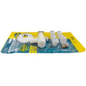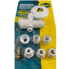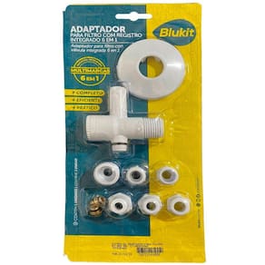 Adaptador para Filtro com Registro Integrado 6 em 1 Blukit Branco - 310906 Permite a ligação do ponto de água na parede, ao aparelho para filtrar água, contendo um regulador de vazão, ponto de derivação de 1/2 e 6 adaptadores que podem ser escolhidos para melhor se adequar na instalação da mangueira ou engate flexível do de seu aparelho filtrante de água. Por Que Este Produto? - Produto completo: com registro, regulador de vazão com fechamento total; - Eficiente: Facilita a instalação de filtros multimarcas, sem a necessidade de identificar o modelo da mangueira ou da conexão para instalação; - Prático: Com dua formas de uso, podendo utilizar torneira e filtro ou somente filtro; - Prático: De fácil instalação, não necessita ferramentas; - Elegante: Embeleza o ambiente com um acabamento branco; - Fabricado no Brasil; Conteúdo: - 01 Adaptador p/ Filtro c/ Registro Integrado 6 em 1 Blukit - 310906; - 01 Acabamento para Parede; - 06 Adaptadores, sendo 3 para mangueiras e 3 para Flexíveis; - 02 Adaptadores para Mangueira com Vedantes; Características: Marca: Blukit Tipo: Adaptador para Filtro Modelo: Com Registro Integrado Mecanismo: Entrada: 1/2 polegada Saída Ponto de Derivação: 1/2 polegada Adaptadores Para Mangueiras: Diâmetro de 1/8 (6,6 mm), 1/4 ( 7,9 mm), 3/8 (9,4 mm) Adaptadores Para Flexíveis: Engate Flexível 3/8, Engate Flexível 1/2 e Engate Flexível 3/8 Modelo Europa Comprimento: 65 mm Largura: 65 mm Altura: 25 mm Material: ABS (Plástico de Engenharia), Latão e Borracha Nitrílica Pressão Máxima: 40 mca Temperatura máxima: 30ºC