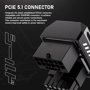 - Adota um conector de especificação 12V2x6 que também é compatível com o conector 12VHPWR, garantindo contato total para entrega segura de corrente, melhorando a segurança no fornecimento de energia.
