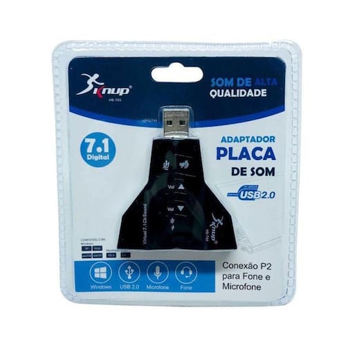 O adaptador placa de som usb knup 7.1 canais é compatível com usb 2.0. Plug-and-play, amplia seu alto-falante ou fone de ouvido estéreo com 7.1 canais. Funciona em qualquer desktop ou notebook, é alimentado via usb. Possui teclas de funções: mudo - microfone /mudo - alto falante, + volume, - volume. 2 saídas para fone e 2 saídas para microfone. Compacto, portátil, fácil de carregar e possui som de alta qualidade.
