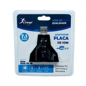 Especificações: Adaptador usb 2.0 externo 7.1 canais; Compatível com usb 2.0, 1.1 e 3.0; Compatível com windows xp/vista/7/8, macintosh os x, e linux 2x; Funciona com qualquer desktop ou notebook, alimentado via usb; Possui teclas de funções: mudo - microfone /mudo - alto falante, + volume, - volume; 2 portas (p2) de saída para fone; 2 portas (p2) de saída para microfone;
