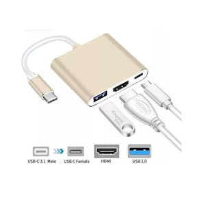 Adaptador USB Tipo C para HDMI 3 em 1 com porta HDMI (até 4K a 60Hz), porta USB Tipo C para fornecimento de energia e porta USB 3.0 para conexão de dispositivos externos. Cabo integrado de 10cm. Caixa de metal resistente.Tipo
