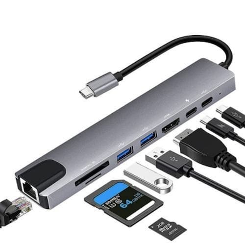 Marca: Universal Modelo: 8 in 1 Unidades por embalagem: 1 Outros Conector de entrada: Ethernet Quantidade de conectores de entrada: 1 Conector de saída: RJ45 Quantidade de conectores de saída: 1 Descrição Estação de acoplamento 8 em 1 hub USB C, porta 4K HDMI + 2 USB 3.0 + TF / cartão SD + PD + Ethernet + 2 Tipo C 3.0 de energia 100 W, forte resistência ao desgaste, rápida dissipação de calor, adequado para Book / Dell / Surface / HP / / PS4 / Switch 1. Esta máquina multifuncional pode expandir uma única porta Tipo C do seu PC / laptop / telefone celular para porta HDMI 8-1 4K 30 Hz, 2 portas USB 3.0, 1 slot para cartão SD e TF, 1 RJ - 45 portas de rede e 2 portas PD de 100W. 2. Transmissão rápida de dados Conecte ao seu dispositivo ou outros dispositivos periféricos USB através da porta USB 3.0. Os slots SD e TF integrados podem facilmente suportar a leitura simultânea de 2 cartões. A porta Ethernet de 100 Mbps garante uma conexão de rede com fio mais estável e rápida. 3. Ultra HD e alta potência Estenda seu book para uma TV que suporte HDMI, com uma resolução de Max 4K UHD 3840 2160 a 30Hz. O carregamento de PD suporta até 100 W de transmissão de energia e pode carregar o Book Pro de 13 , 15 e 16 em velocidade total usando todas as portas de dados. 4. Geral Adaptador multiporta adequado para book Pro, Matebook X, MI Air Google Chromebook Dell, HP, etc. Torne sua vida mais inteligente 5. Portátil de alta qualidade Carcaça de alumínio de grau de aviação, resistente à corrosão e resistente ao desgaste. O adaptador USB C é leve e pequeno, por isso cabe facilmente no seu bolso. Você pode carregá-lo convenientemente com você para viagens de negócios, etc. Homologação Anatel: 000801300160