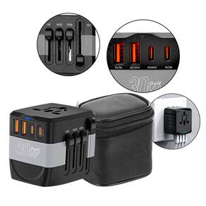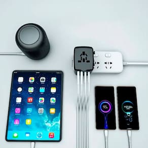 Compatível com tomadas US, AU, UK e EU Funciona em mais de 150 países Ideal para viagens internacionais 2 portas USB-A e 2 USB-C Tecnologia de carregamento rápido Design compacto e leve Seguro e fácil de transportar