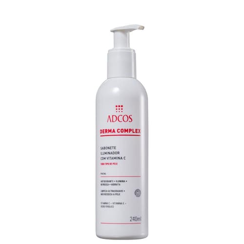 Sabonete facial para todos os tipos de pele, especialmente desvitalizadas. Adcos Derma Complex Iluminador com Vitamina C é ideal para higiene facial diária, refresca, hidrata e revitaliza a pele.