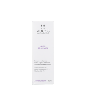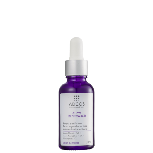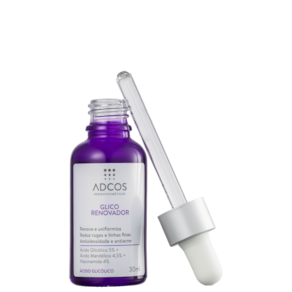 Sérum Adcos Glico Renovador apresenta fórmula concentrada com Ácido Glicólico, Niacinamida e 10% de ácidos renovadores. Ajuda a reduzir a acne, os poros e a oleosidade, corrige os sinais do envelhecimento, como rugas e linhas finas, ilumina e uniformiza a tonalidade da pele, e renova a região sem irritar, tornando-a mais lisa e uniforme.