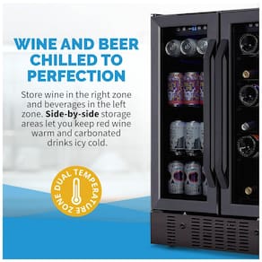 TODAS AS SUAS BEBIDAS FAVORITAS EM UM LUGAR Esta geladeira de bebidas de zona dupla possui duas áreas de zenamento lado a lado, permitindo que você mantenha vinho tinto quente e bebidas gaseificadas geladas. As portas de vidro com painéis duplos oferecem excelente isolamento e podem ser trancadas para maior segurança. Os LEDs azuis iluminam o interior para um visual moderno.