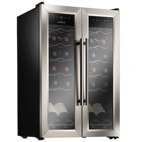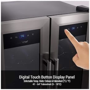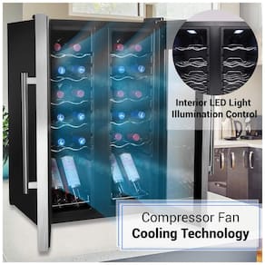 Adega climatizada de zona dupla, controle digital, porta de vidro com estrutura e alça de aço inoxidável, racks de vinho cromado polido, prateleira inferior para garrafas em pé.Capacidade total de garrafas