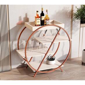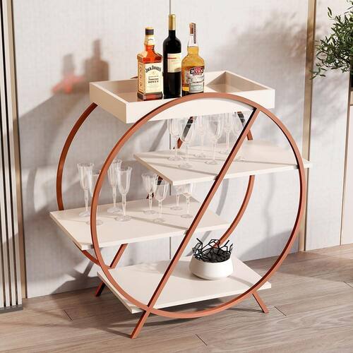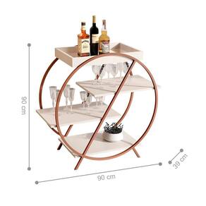 Contém quatro prateleiras para facilitar o armazenamento de garrafas, taças e objetos decorativos, possui espelho na base da bandeja.