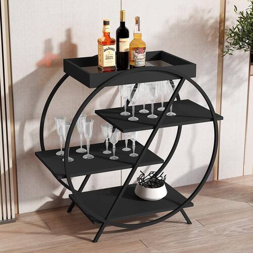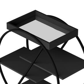 Contém quatro prateleiras para facilitar o armazenamento de garrafas, taças e objetos decorativos, possui espelho na base da bandeja.