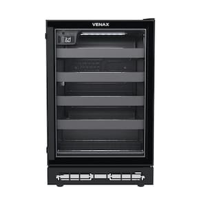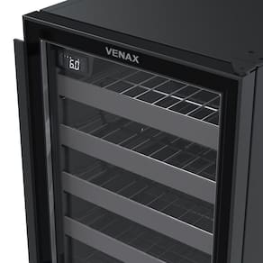 Adega Venax Cave In 100, 82L, com controle digital de temperatura (6°C a 20°C), iluminação LED, porta de vidro duplo, sistema de refrigeração por compressor e capacidade para 24 garrafas.Capacidade total de garrafas
